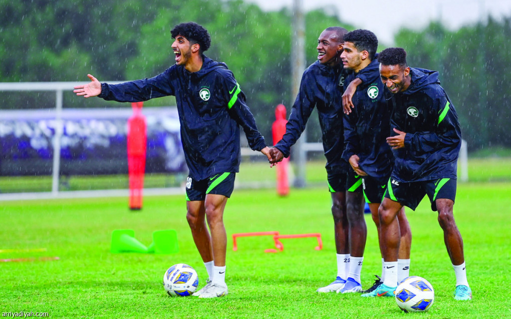 صورة التقطت أمس لزياد الجهني، لاعب وسط المنتخب السعودي الأولمبي لكرة القدم، وزملائه سعود عبد الحميد ومتعب الحربي وحامد الغامدي، خلال آخر تدريبات الأخضر تأهبًا لموقعة ربع نهائي كآس آسيا تحت 23 عامًا، اليوم، أمام فيتنام(المركز الإعلامي ـ المنتخب السعودي)