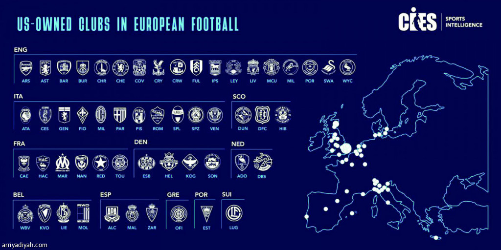 وفي إيطاليا، يمتلك الأمريكيون 11 ناديًا في مختلف درجات دوريات كرة القدم في البلاد، إلى جانب ستة أندية في فرنسا، وأربعة في كلٍّ من الدنمارك وبلجيكا، وثلاثة في إسكتلندا وإسبانيا، وناد واحد في البرتغال وألمانيا وسويسرا.