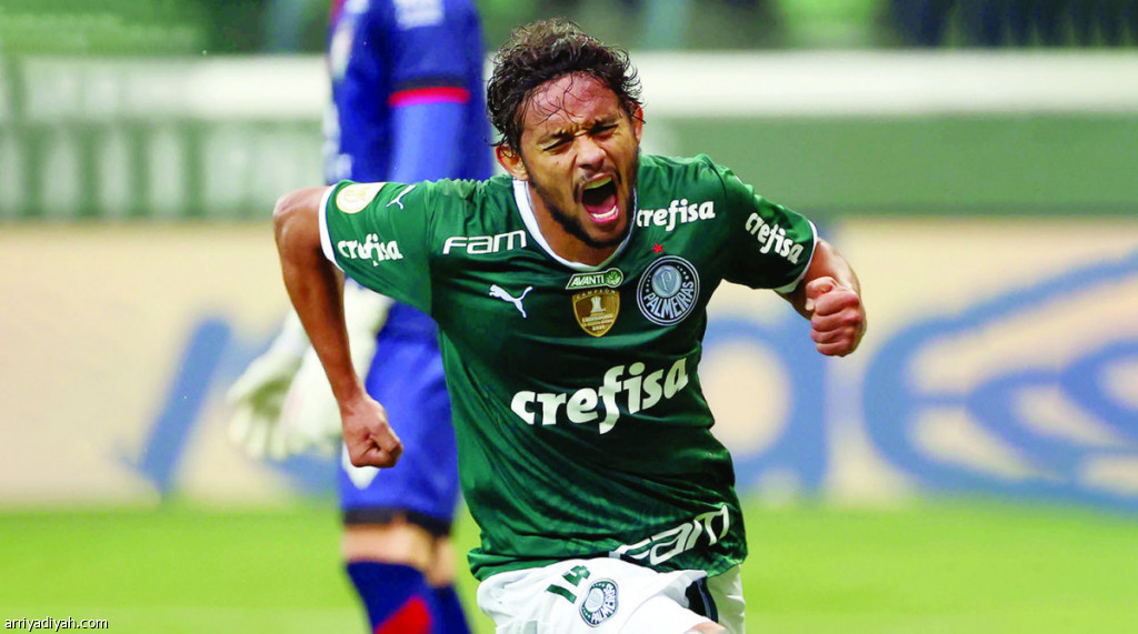 صورة التقطت أمس لجوستافو سكاربا يحتفل بتسجيله الهدف الثالث لبالميراس في شباك جويانيينسي (المركز الإعلامي - بالميراس)