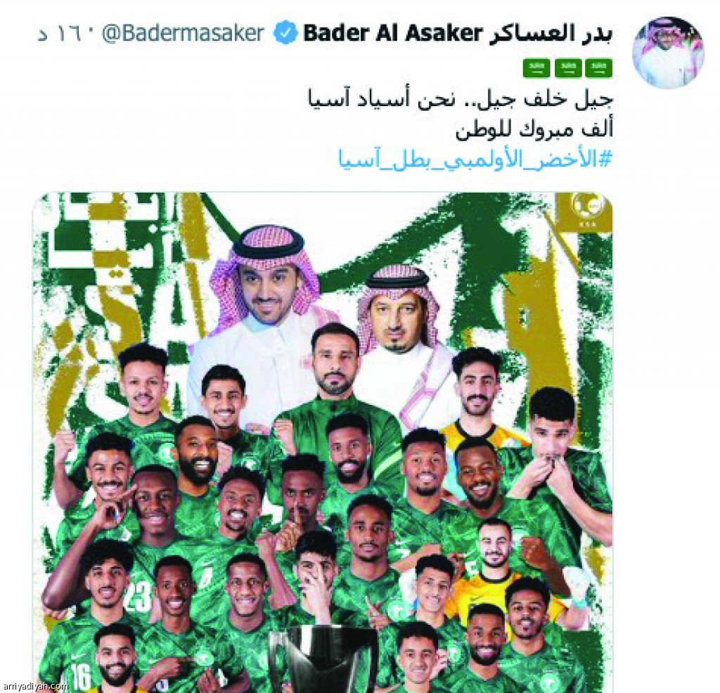 وكتب بدر العساكر، مدير المكتب الخاص لولي العهد “جيل خلف جيل.. نحن أسياد آسيا.. ألف مبروك للوطن”.