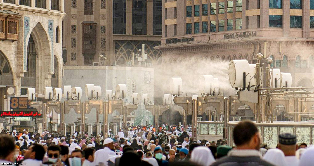 تتولى نحو 250 مروحة رذاذ تلطيف الأجواء الحارة في المسجد الحرام وساحاته، وفقًا لموقع رئاسة شؤون الحرمين الإلكتروني.