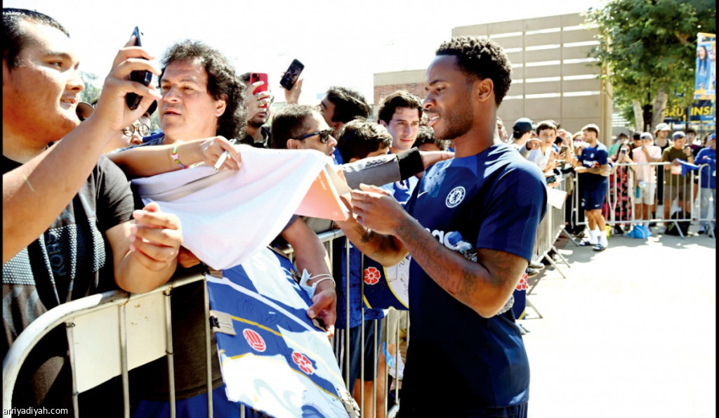 صورة التقطت أمس للإنجليزي رحيم ستيرلينج، لاعب فريق تشيلسي الإنجليزي الأول لكرة القدم، يوقِّع على قمصان الجماهير عند وصوله إلى النادي (تشيلسي)