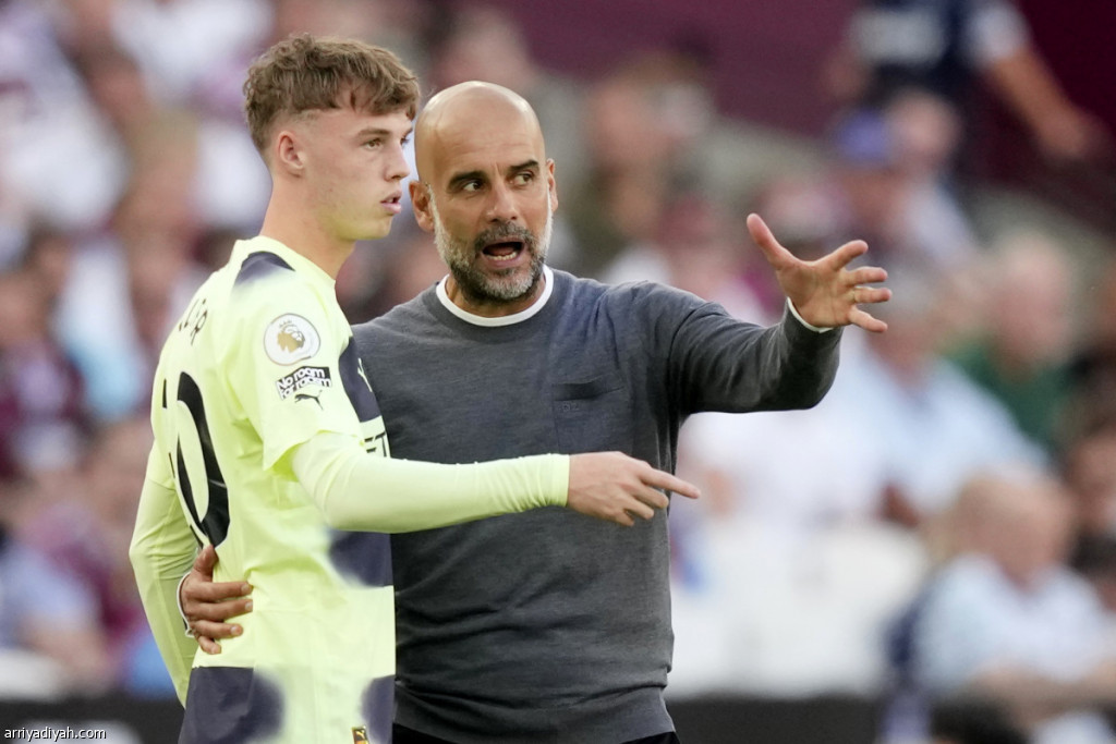 صورة التقطت أمس للإسباني بيب جوارديولا، مدرب فريق مانشستر سيتي الإنجليزي الأول لكرة القدم يوجه كول بالمر خلال لقاء وستهام يونايتد الذي انتهى بفوز السيتي بهدفين نظيفين (الأوروبية)