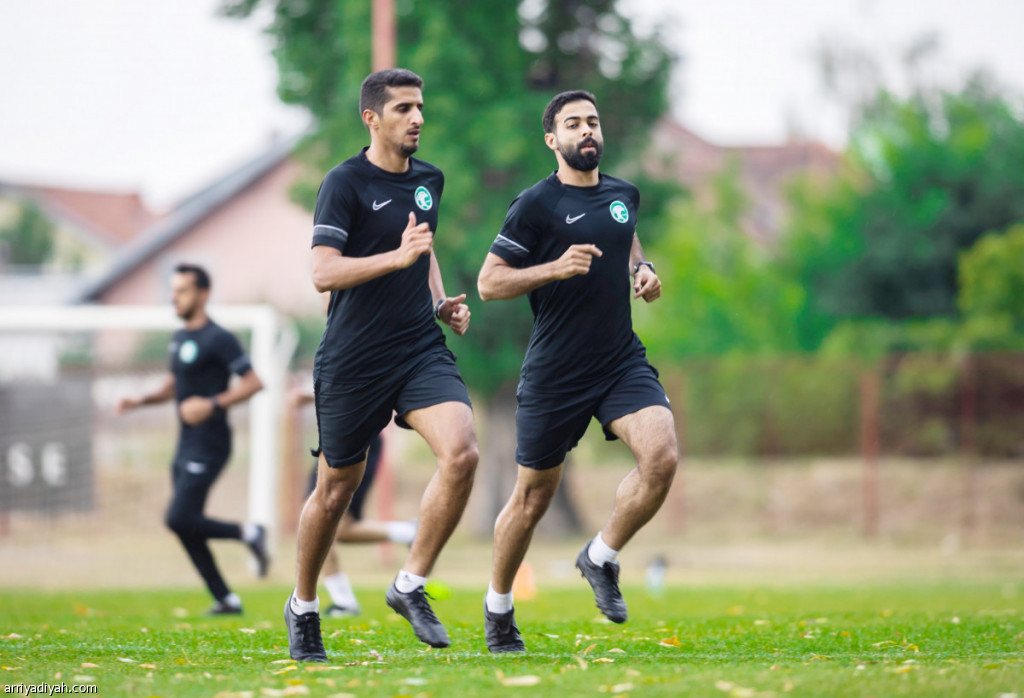 صورة التقطت أمس لعبد الله الخربوش ومحمد العمري، حكمَي الساحة، يجريان بعض التدريبات اللياقية في معسكر نوفي ساد الصربية (المركز الإعلامي ـ اتحاد القدم)