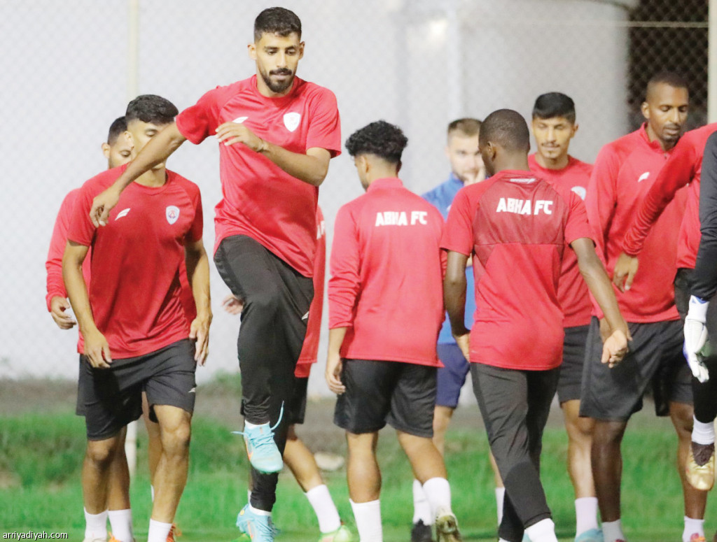 صورة التقطت أمس الأول لمطير الزهراني لاعب فريق أبها الأول لكرة القدم يتقدم زملاءه أثناء التدريبات(المركز الإعلامي - أبها)