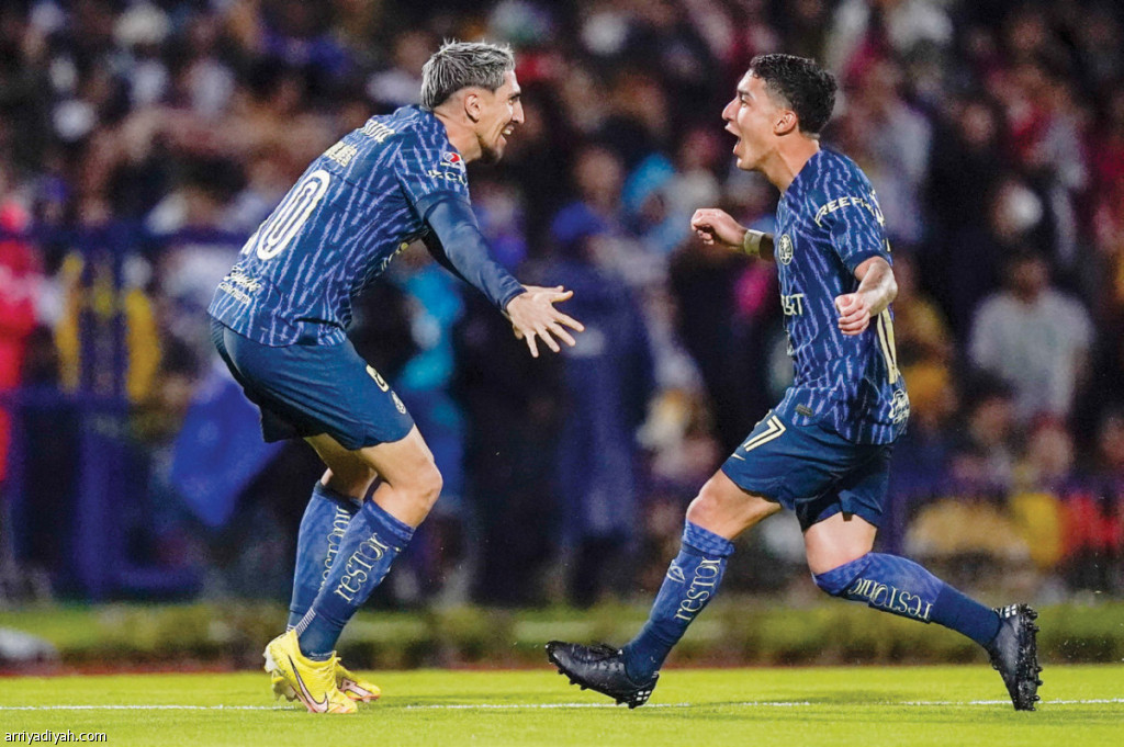 صورة التقطت أمس لأليخاندرو زينديجا، ودييجو فالديز، لاعبيّ فريق كلوب أمريكا، أثناء احتفالهما بالهدف الثالث خلال المباراة ضد بوماس أونام في الدوري المكسيكي لكرة القدم (الألمانية)