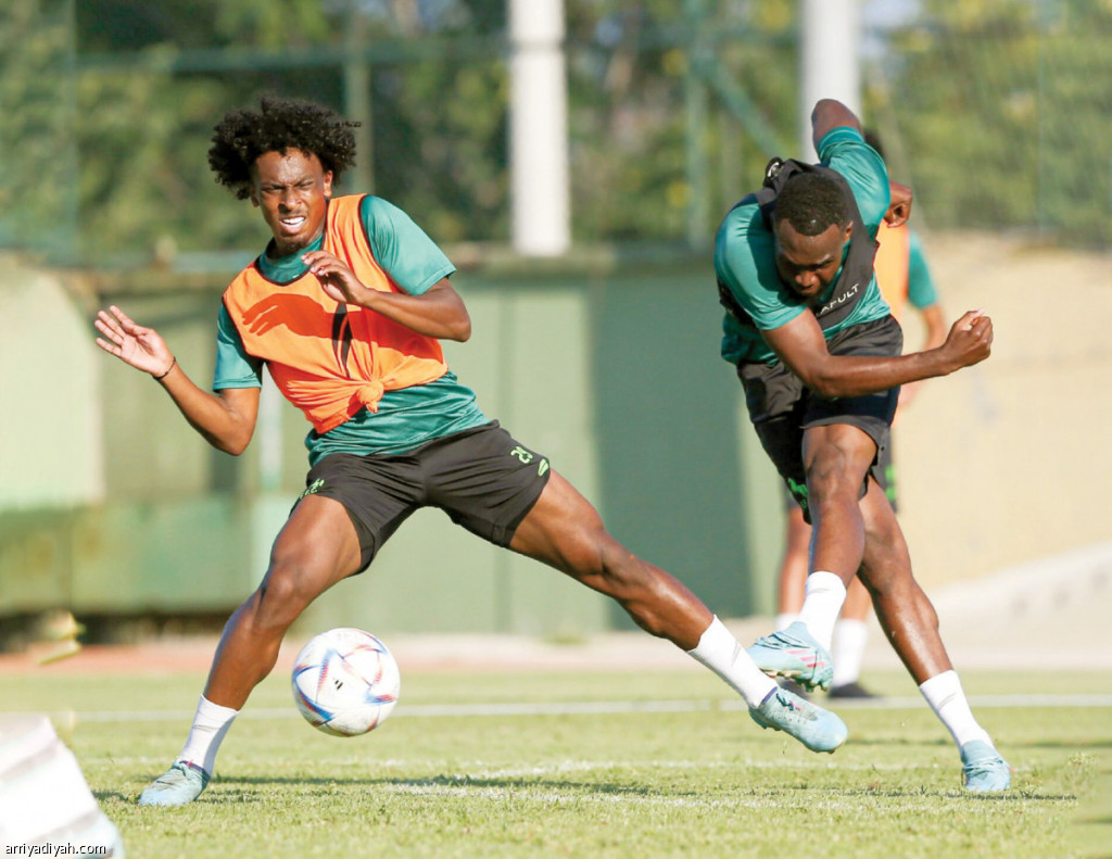 صورة التقطت أمس للفرنسي يوسف نياكاتي لاعب فريق الاتفاق يسدد الكرة أثناء التدريبات ويبدو زميله فهد خالد (المركز الإعلامي ـ الاتفاق)