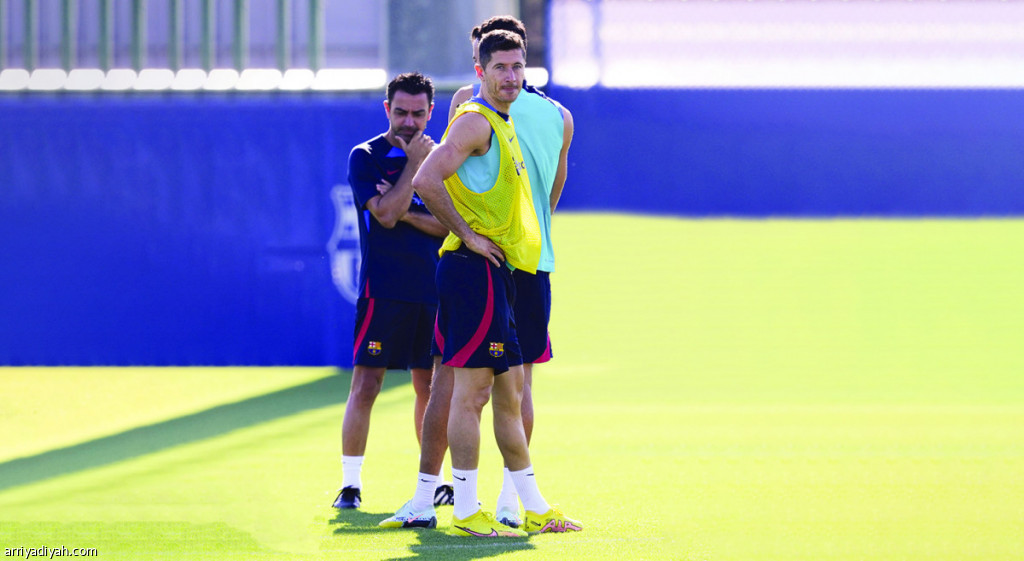 صورة التقطت أمس للإسباني تشافي هيرنانديز، مدرب برشلونة، أثناء التدريبات، ويبدو البولندي روبرت ليفاندوفسكي، المنتقل حديثًا من بايرن ميونيخ(الأوروبية)