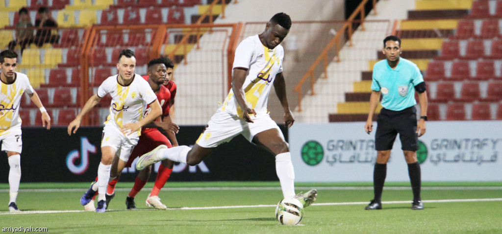 صورة التقطت أمس للسنغالي باباكار جوي، مهاجم أحد، ينفذ ركلة جزاء أسفرت عن هدف لفريقه في مرمى نجران (المركز الإعلامي ـ أحد)