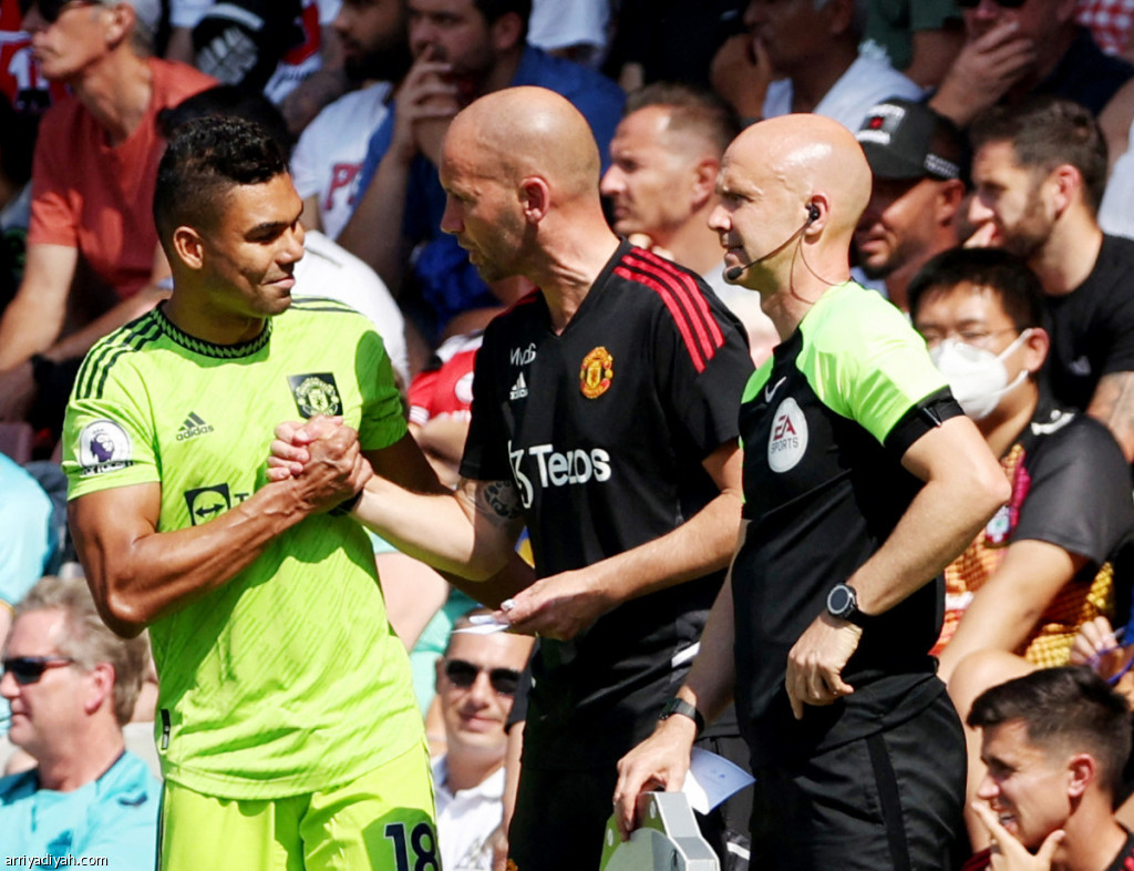 صورة التقطت أمس للبرازيلي كاسيميرو، لاعب وسط فريق مانشستر يونايتد الأول لكرة القدم الجديد، مع الهولندي إريك تين هاج، مدرب الفريق، قبل مشاركته في المباراة الأولى له مع النادي الإنجليزي (الفرنسية)
