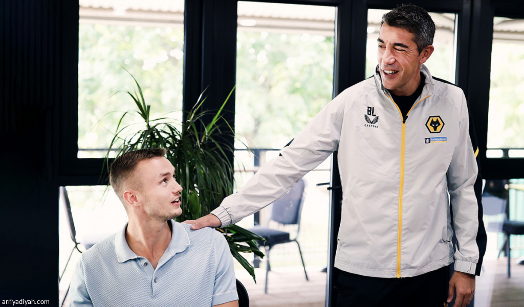 صورة التقطت أمس للبرتغالي برونو لاجي مدرب فريق وولفرهامبتون يرحب باللاعب النمساوي ساسا كالادزيتش (المركز الإعلامي ـ وولفرهامبتون)
