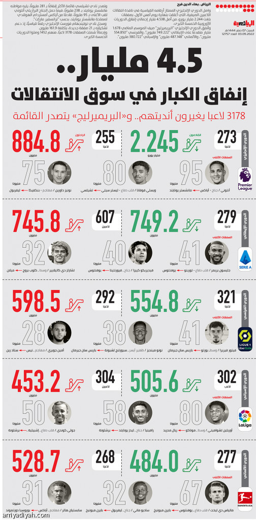 واصل الدوري الإنجليزي الممتاز أرقامه القياسية في نافذة انتقالات اللاعبين الصيفية، التي أغلقت بنهاية يوم أمس الأول، بصفقات بلغت 2.244 مليار يورو، من أصل 4.538 مليار إجمالي إنفاق الدوريات الأوروبية الخمسة الكبرى.