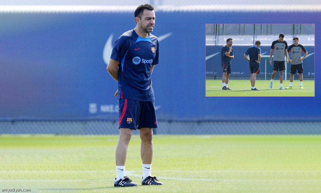 صورة التقطت أمس للإسباني تشافي هيرنانديز مدرب فريق برشلونة الأول لكرة القدم، خلال جلسة التدريب الأخيرة قبل مواجهته فيكتوريا بلزن اليوم، ضمن منافسات دوري أبطال أوروبا.. ويظهر في الإطار تشافي يجتمع باللاعبين في ختام التدريب (الأوروبية)