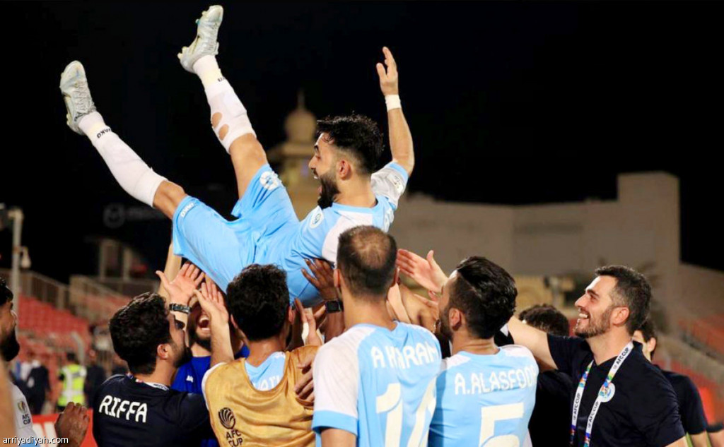 صورة التقطت أمس من احتفال فريق الرفاع البحريني الأول لكرة القدم، بعد تأهله إلى نهائي كأس الاتحاد الآسيوي (إنستجرام فريق الرفاع)