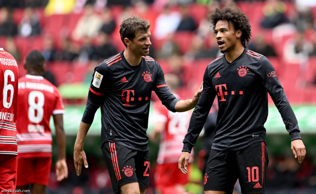 صورة التقطت أمس لتوماس مولر وليروي ساني، لاعبَي فريق بايرن ميونيخ الأول لكرة القدم، خلال المباراة أمام أوجسبورج (الفرنسية)