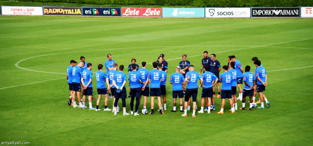 صورة التقطت أمس لنجوم المنتخب الإيطالي الأول لكرة القدم في الحصة التدريبية الأولى استعدادًا للجولتين الخامسة والسادسة من دوري الأمم الأوروبية (حساب تويتر ـ المنتخب الإيطالي)