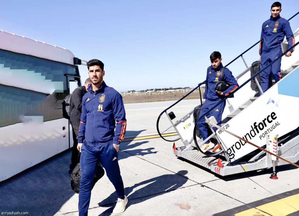 صورة التقطت أمس للإسباني ماركو أسينسيو، أثناء وصول بعثة منتخب بلاده إلى البرتغال للقاء منتخبها اليوم ضمن منافسات دوري الأمم الأوروبية.. ويظهر زملاؤه بيدري وفيران توريس (تويتر ـ المنتخب الإسباني)