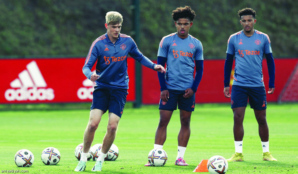 صورة التقطت أمس يظهر فيها المهاجمون جادون سانشو وشولا شوريتير وتشارلي ماكينل خلال تدريبات مانشستر يونايتد (المركز الإعلامي ـ يونايتد)