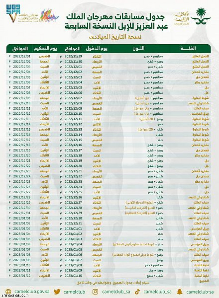 وتضمن الجدول الفئات المشاركة في السباقات ولون كل فئة وتاريخ الدخول ويوم التحكيم، حيث حُدِّد يوم الثلاثاء الموافق 29/11/1443هـ ليكون أول يوم لدخول المشاركين، على أن يكون الخميس الأول من ديسمبر المقبل أول يوم في التحكيم.