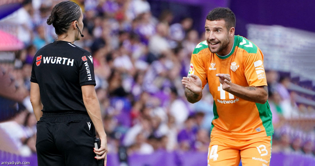 صورة التقطت أمس للإسباني آيتور رويبال، مهاجم ريال بيتيس، يتحدث مع مساعدة الحكم بعد طرد زميله بيزيلا(الفرنسية)