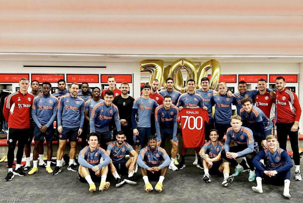 صورة التقطت أمس للبرتغالي كريستيانو رونالدو، لاعب فريق مانشستر يونايتد الإنجليزي الأول لكرة القدم، برفقة زملائه، رافعًا قميص اليونايتد المخصص باحتفالية وصوله إلى الهدف الـ700 في تاريخه مع الفرق (تويتر مانشستر يونايتد)