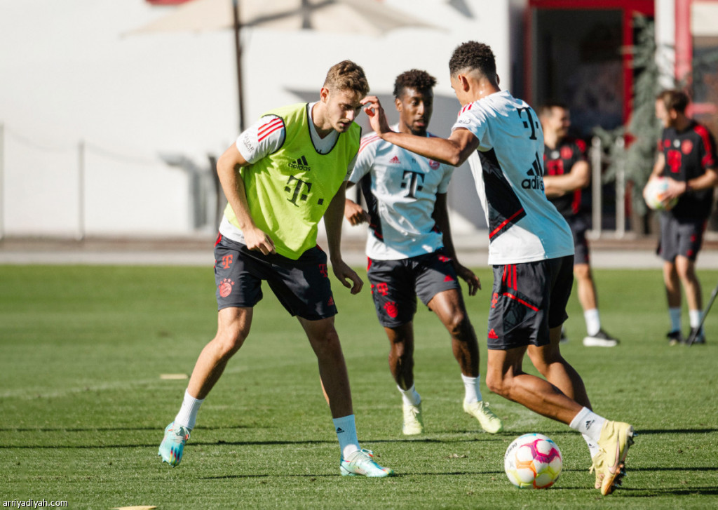 صورة التقطت أمس للاعبي فريق بايرن ميونيخ الألماني الأول لكرة القدم أثناء إحدى الحصص التدريبية (تويتر بايرن ميونيخ)