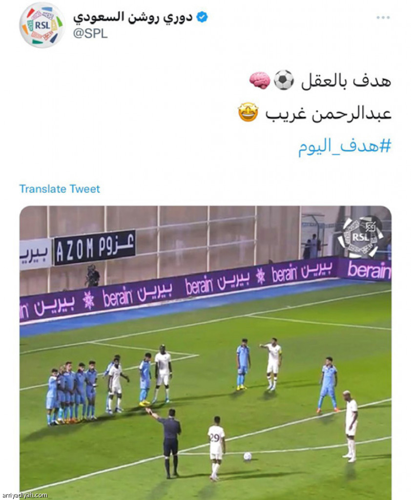 عرض حساب دوري روشن السعودي في “تويتر”، أمس، هدف عبد الرحمن غريب، لاعب فريق النصر الأول لكرة القدم، أمام الباطن، وعلَّق عليه: “هدف بالعقل”. وحصد الفيديو أكثر من 38 ألف مشاهدة خلال أربع ساعات من بثّه، إضافةً إلى 580 إعجابًا و87 ردًّا. ومن بين الردود، علَّق حساب عاشق العالمي: “موهبتنا العظيمة”.
