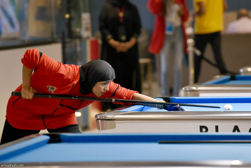 صورة التقطت أمس لنجلاء النعيمي، لاعبة البلياردو، أثناء خوضها نزال البرونزية في دورة الألعاب السعوديةتصوير: يزيد الضويحي