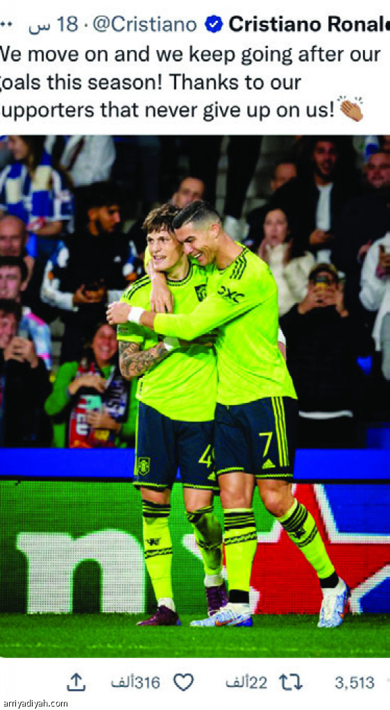 شكر البرتغالي كريستيانو رونالدو، مهاجم فريق مانشستر يونايتد الأول لكرة القدم، عبر “تويتر”، أمس الأول، جماهير النادي على دعمها المستمر. ونالت التغريدة 3.4 ألف رد، 22 إعادة تغريد، و311 ألف إعجاب.