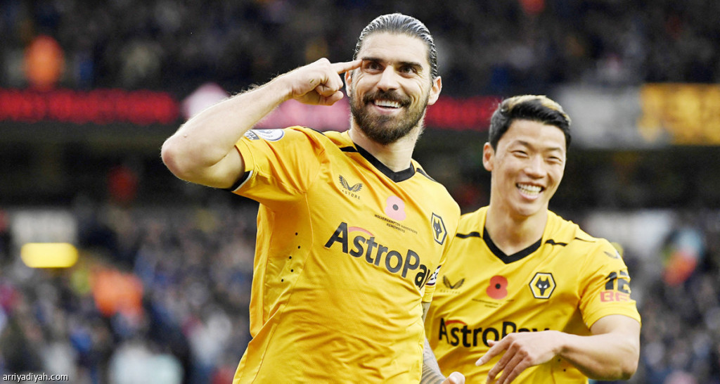 صورة التقطت أمس للبرتغالي روبن نيفيز، مهاجم فريق وولفرهامبتون الأول لكرة القدم، يحتفل مع الكوري الجنوبي هوانج تشان بتسجيله الهدف الثاني في المباراة التي خسرها الفريق أمام برايتون 2-3 في الدوري(الأوروبية)
