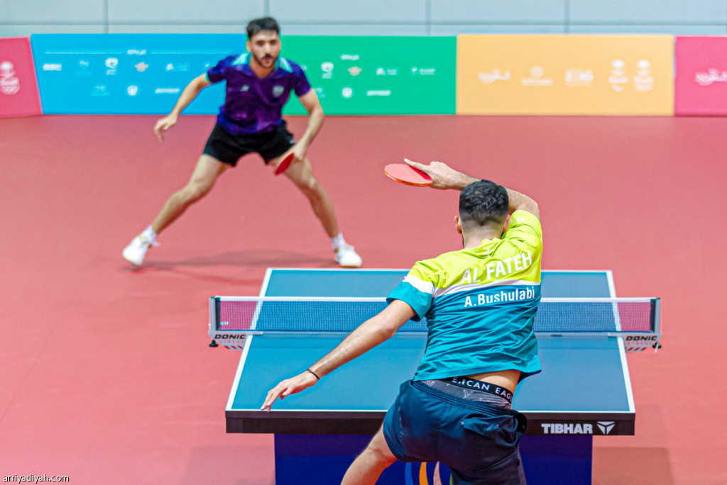 صورة التقطت أمس لعبد العزيز بوشليبي، لاعب الفتح، وعلي الخضراوي، لاعب الأهلي، يتواجهان في نصف نهائي كرة الطاولة ضمن دورة الألعاب السعودية (المركز الإعلامي - الألعاب السعودية)