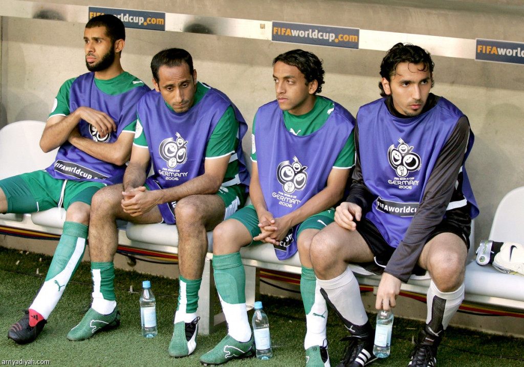 صورة التقطت لمحمد الشلهوب يجلس متوسطًا زملاءه الخثران والجابر وخوجة على مقاعد البدلاء خلال مباراة المنتخب السعودي أمام نظيره التونسي في مونديال 2006 (أرشيفية)