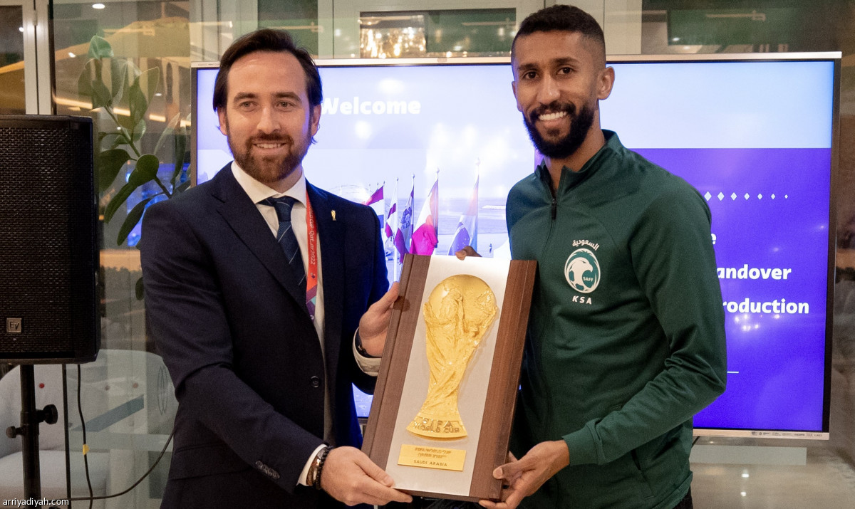 تسلم سلمان الفرج قائد المنتخب السعودي الأول لكرة القدم، الخميس، درع المشاركة في كأس العالم 2022، خلال اجتماع ممثلي اللجنة المنظمة للمونديال مع بعثة الأخضر السعودي، في مقر سكنها في الدوحة العاصمة القطرية.