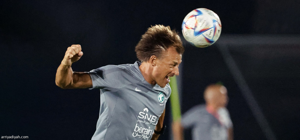 صورة التقطت أمس للفرنسي هيرفي رينارد مدرب المنتخب السعودي الأول لكرة القدم، يسدد الكرة برأسه خلال الحصة التدريبية الأولى للأخضر في قطر استعدادًا لنهائيات كأس العالم 2022 التي تنطلق بعد غدٍ (الفرنسية)