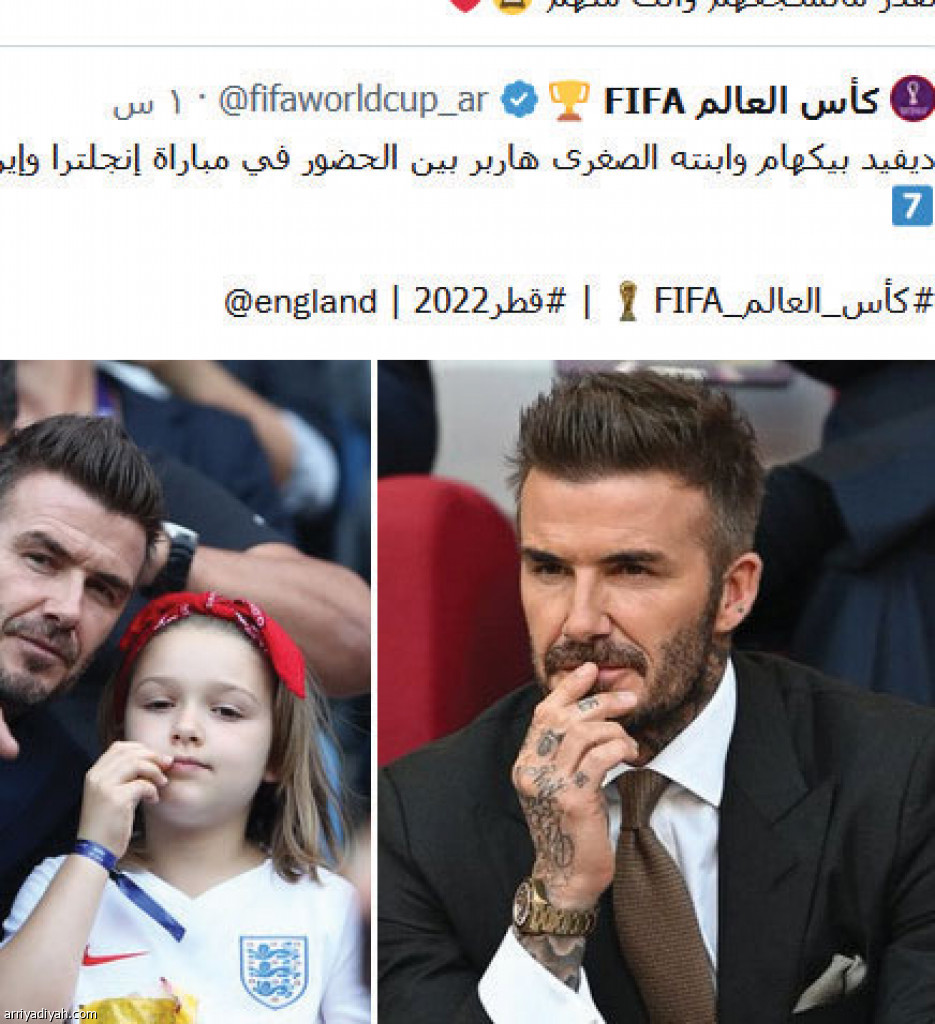 وجاءت صور بيكهام برفقة ابنته في مدرجات استاد خليفة الدولي في الدوحة، العاصمة القطرية، ونشرها حساب كأس العالم FIFA، الذي يتابعه نحو 2.5 مليون، وسجلت نحو 40 تعليقًا، ومن بينها ما كتبته المغردة حلا: “ما نقدر ما نشجعهم وأنت منهم”.