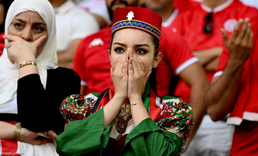 صورة التقطت أمس لمشجعةٍ تونسيةٍ تتحسَّر عقب نهاية المباراة بخسارة منتخب بلادها أمام أستراليا (الفرنسية)