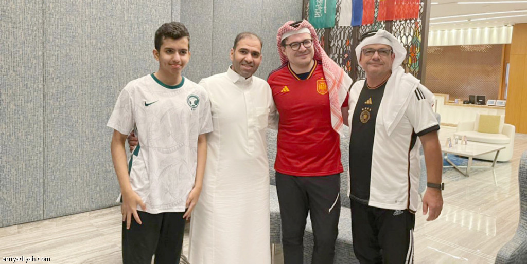 صورة التقطت أمس للكندي تيفيز لاريا ونجله ألبيرت يرتديان الشماغ والعقال مع فلاح العنزي، وكيل التعاقدات السعودي، وابنه ريان خلال حضورهم مواجهة ألمانيا وإسبانيا (صورة خاصة بـ”الرياضية”)