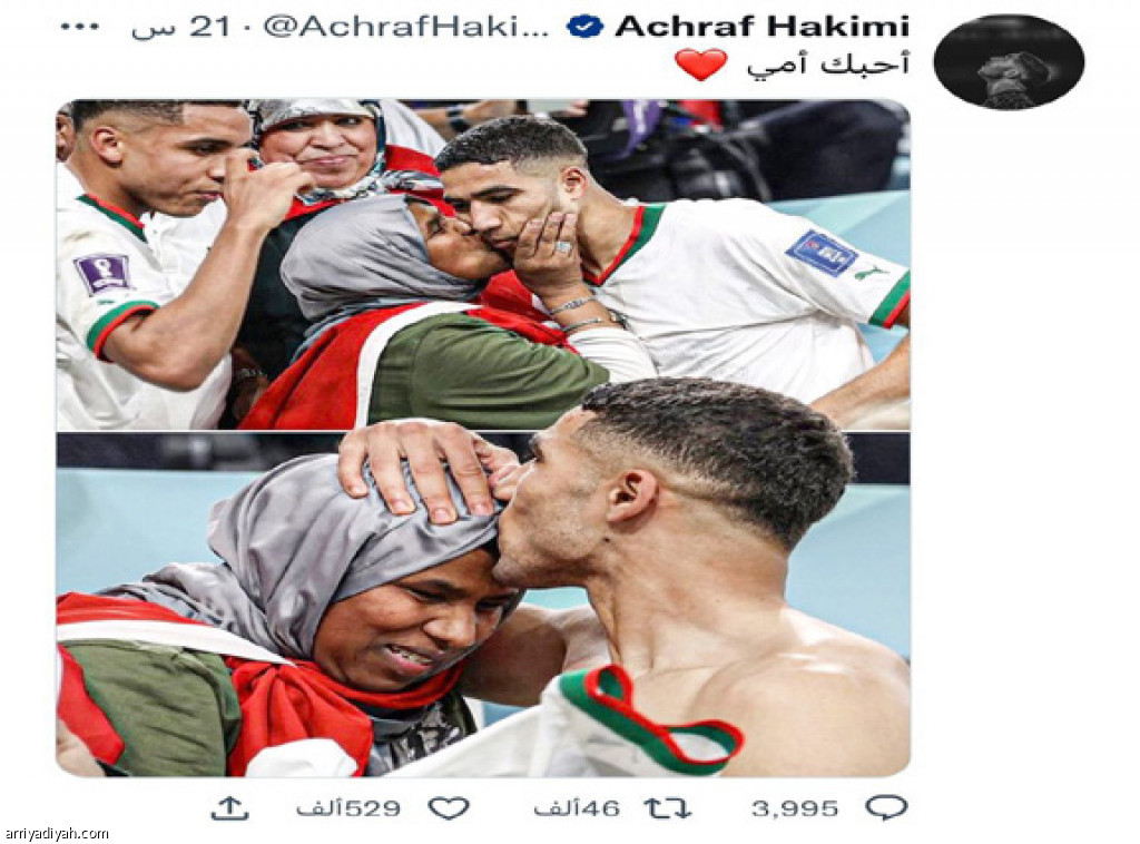 غرّد المغربي أشرف حكيمي مدافع منتخب بلاده الأول لكرة القدم، عبر “تويتر”، أمس الأول، بصورة من فرحته مع والدته في المدرجات بعد الانتصار على بلجيكا 2ـ0.