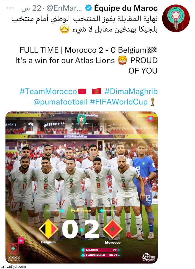 غالبية التغريدات المغربية كانت فخورة بالانتصار الكبير لأسود الأطلس على غرار محمد الحزار الذي كتب ساخرًا من المنتخب البلجيكي: “وينو.. لوكاكو”، مضيفًا: “هذا صوت مشجع مغربي يغني على طريقة “الأوبرا” بعد الفوز التاريخي لأسود الأطلس على بلجيكا”. على النهج ذاته كتب الصحافي المغربي محمد علاء: “مباراة رائعة للفريق كله قتالية وحشية مباراة قوية من الجميع، لكن التأهل لم يكتسب بعد واستمتع بل ركز بسرعة على المباراة الأخيرة”. أيضًا كتب يوسف عبد الله ممتدحًا زياش بشكل خاص: “حقًا لا أستطيع أن أجد الكلمات لأشكر زياش الذي قدم مباراة رائعة جدًا من الناحية العملية والدفاعية والهجومية”، مضيفًا: “إنه يستحق إلى حد كبير رجل المباراة”.