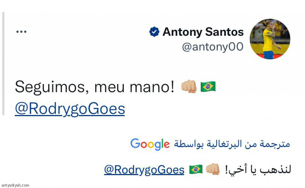 غرَّد البرازيلي أنتوني، مهاجم منتخب بلاده الأول لكرة القدم، عبر تويتر، أمس، معلقًا على صورة، تجمعه بمواطنه رودريجو جوس قائلًا: “لنذهب يا أخي”. ونال المنشور 46 ردًّا، و254 إعادة تغريد، و7.4 ألف إعجاب.