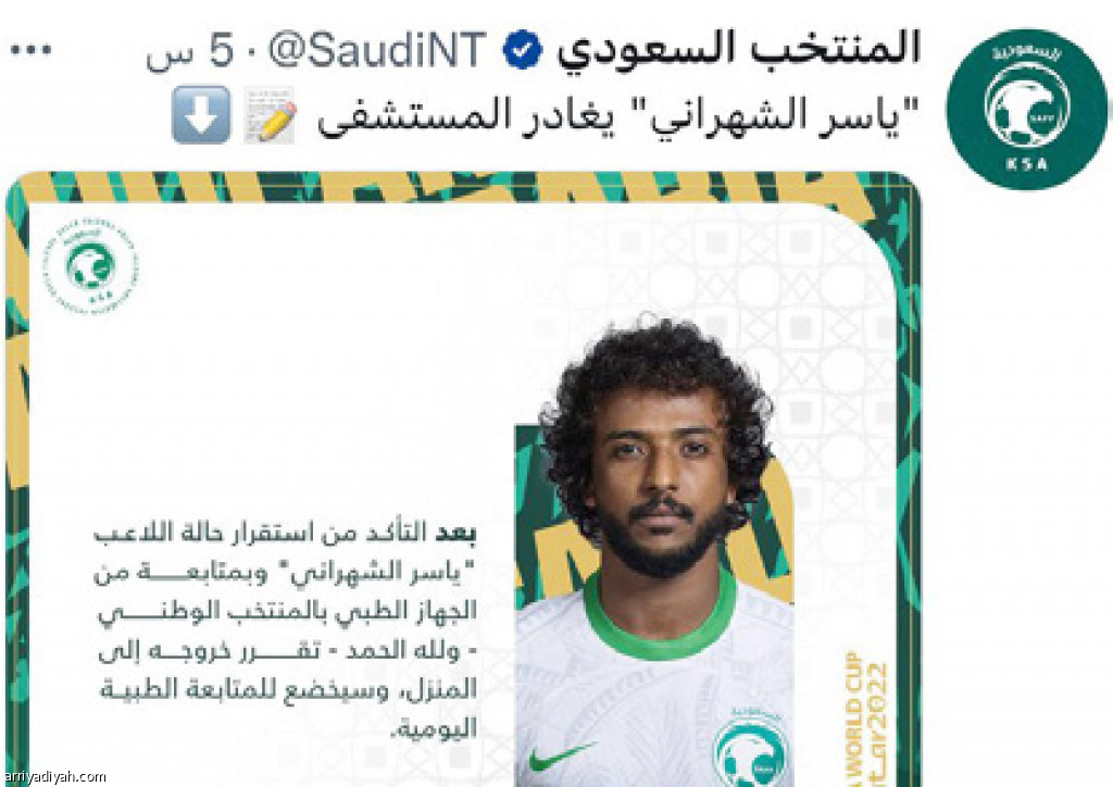 تفاعل مستخدمو موقع التدوينات القصيرة “تويتر”، مع تغريدة المنتخب السعودي، التي أعلنت خروج ياسر الشهراني، مدافع المنتخب السعودي الأول لكرة القدم، من المستشفى، بعد استقرار حالته الصحية. ونالت التغريدة تفاعلًا واسعًا بحصولها على 1.1 ألف رد، و1.7 ألف إعادة تغريد، و5.8 ألف إعجاب، خلال ثلاث ساعات من بثها، وجاءت غالبية الردود متمنية للشهراني دوام الصحة والعافية، من بينهم علي النفيسة: “يا رب لك الحمد، الله يتمم عليه الصحة والعافية، وما تشوف شر”، وعلى السياق ذاته، كتبت داليا: “الحمد لله على سلامته”. وكان الشهراني قد أصيب في مباراة الأرجنتين بالجولة الأولى من المجموعة الثالثة، التي انتهت بفوز الأخضر 2ـ1.