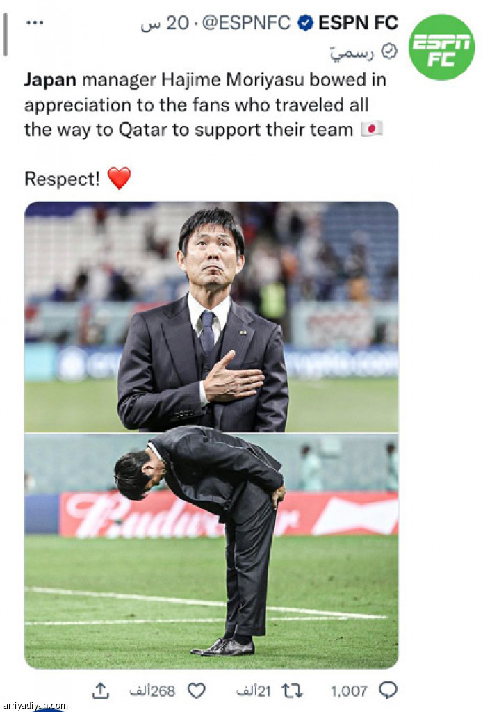 سيطر خروج منتخب اليابان الأول لكرة القدم على يد نظيره الكرواتي على اهتمامات مستخدمي موقع التدوينات القصيرة “تويتر” خلال الـ 24 ساعة الماضية. وجاءت غالبية التعليقات مثنية على الظهور القوي لـ “محاربي الساموراي” في كأس العالم قطر 2022، من بينهم الحساب الشهير “بي آر” المهتم بكرة القدم، إذ علق قائلًا: “هزموا ألمانيا وهزموا إسبانيا. لقد خرجوا من وصيف مونديال 2018 بركلات الترجيح فقط”. مضيفًا: “اليابان أعطتنا كل ما لديها”. فيما أثنى مغردون على انحناء الياباني هاجيمي مورياسو، مدرب منتخب بلاده، أمام الجماهير، من بينهم “آي أس بي إن” الذي قال: “انحنى تقديرًا للمشجعين طوال الطريق إلى قطر لدعم وطنهم.. احترامًا”.