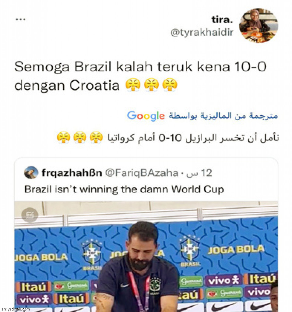 استحوذت مباراة منتخب البرازيل الأول لكرة القدم، أمام نظيره الكرواتي اليوم، على اهتمامات مستخدمي “تويتر”، قبل انطلاقها بـ 24 ساعة. واتجهت توقعات مستخدمي المنصة نحو انتصار منتخب السامبا بكل أريحية، ومن بينهم “تايمس” قائلًا: “البرازيل الآن متحدة للغاية حول نيمار.. سيفوز بالتأكيد”، فيما تمنى مغردون انتصار كرواتيا بعد تعامل مترجمي منتخب البرازيل مع قطة داهمت قاعة المؤتمرات الصحافية بطريقة عدت غير لائقة، مثل “تيرا” كاتبة: “نأمل أن تخسر البرازيل 0ـ10 أمام كرواتيا”.