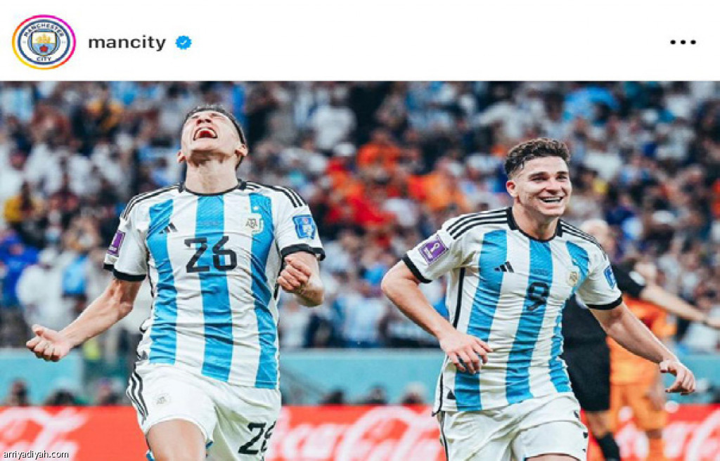 بث حساب نادي مانشستر سيتي الإنجليزي في “إنستجرام”، أمس، صورًا للأرجنتيني جوليان ألفاريز، مهاجم الفريق الأول لكرة القدم، يظهر فيها سعيدًا بتأهل منتخب بلاده إلى نصف نهائي المونديال، وعلَّق: “تهانينا لك ألفاريز بالتأهل”.