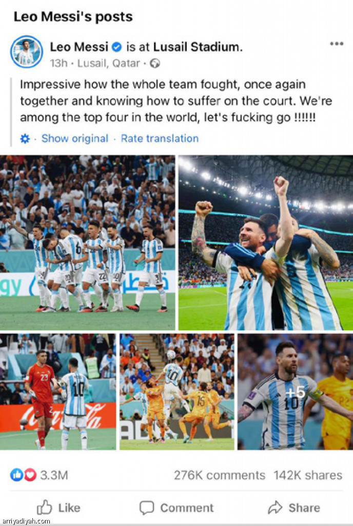 عرض ليونيل ميسي، لاعب منتخب الأرجنتين الأول لكرة القدم، أمس، عبر حسابه في منصة “فيسبوك” مجموعة من الصور بعد انتصار “التانجو” على هولندا، والوصول إلى نصف نهائي بطولة كأس العالم قطر 2022. وحصدت الصور تفاعلًا واسعًا، وصل إلى ثلاثة ملايين إعجاب، و177 ألف مشاركة، و280 ألف رد خلال 14 ساعة من بثها. وأثنت عديد من الردود على مستوى النجم الأرجنتيني، منها حساب كريستيان الذي قال: “ شكرًا ميسي نحلم بتحقيق اللقب، استمر بالمستوى الرائع نفسه”. ومن بين الردود، قال حساب “أرخنتينا”: “كل الشكر لفريقنا الرائع والنجم الأفضل ليونيل. المباراة كانت رائعة وحبست أنفاسنا”.