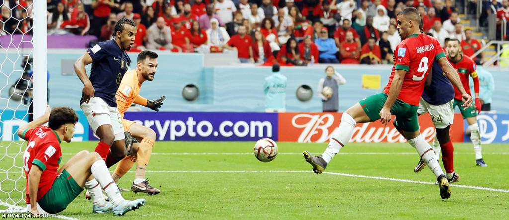 صورة التقطت أمس الأول للمغربي عبد الرزاق حمد الله خلال فرصة على مرمى منتخب فرنسا في مواجهة نصف النهائي (الأوروبية)