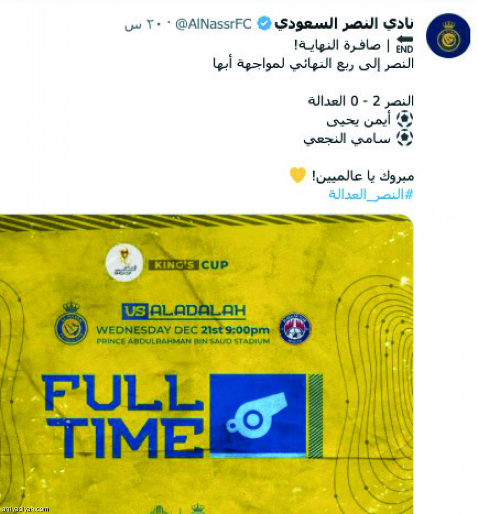 على الطرف الآخر، تفاعل النصراويون مع فوزهم على العدالة قبل مواجهة الهلال، مثل بندر العنزي، الذي كتب: “فوز مهم ومريح، والوعد الإثنين الجاي، ليلة للعالمي”، وعلى النهج ذاته، كتبت فوز الشمري: “النصر يتسلطن على العدالة بأقل مجهود، ويوجه رسالة قوية للجاري قبل الديربي”.