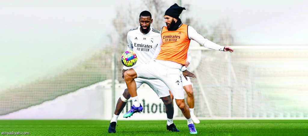 صورة التقطت أمس للمهاجم الفرنسي كريم بنزيمة يحاول السيطرة على الكرة من أمام الألماني أنطونيو رودجير، قلب الدفاع، خلال الحصة التدريبية لفريق ريال مدريد الإسباني الأول لكرة القدم(المركز الإعلامي ـ ريال مدريد)