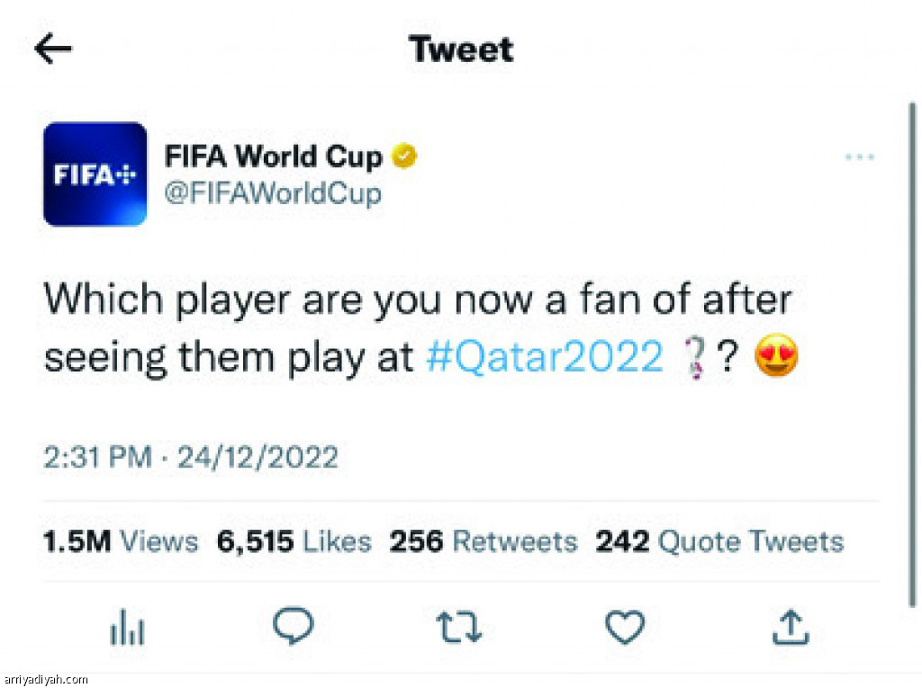 تساءل حساب “فيفا كأس العالم” في منصة “تويتر”، أمس، عن اللاعب الأفضل خلال مونديال قطر 2022، الذي انتهى أخيرًا.