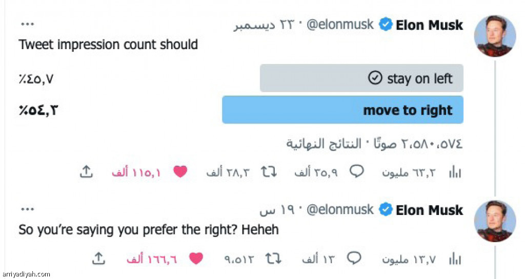 استحوذت التغييرات التي أجراها الملياردير الأمريكي إيلون ماسك، مالك موقع التدوينات القصيرة “تويتر”، على اهتمامات مستخدمي الموقع الأكثر انتشارًا في العالم، خلال الـ 24 ساعة الماضية، فبعد أيام قليلة على إطلاق ميزة كشف مشاهدات التغريدة، طرح ماسك استطلاعًا حول: هل يجب “حساب عدد مرات ظهور التغريدة”. وبعد انتهاء التصويت، الذي استمر 24 ساعة، وشارك فيه نحو مليوني مغرد، كتب ماسك: “إذن أنت تقول إنك تفضّل؟”. دون أن يوضح مقصده.